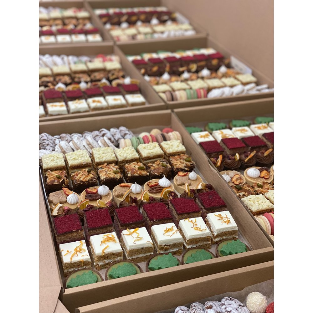 Veľkosť koláčikov - kocky 4x4cm , tartaletky 5,5cm , macarons 3,8cm , cookies 5cm , laskonky 4,5cm , košíčky 4cm